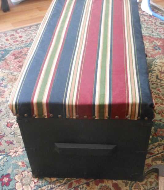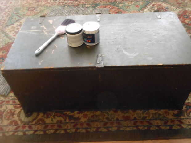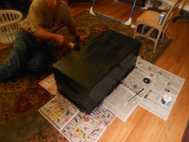 Entré en la sala de estar y mi maridito tenía poner periódico en el footlocker y había agarrado mi pintura y su pincel favorito y estaba pintando el footlocker negro. Ya se veía mucho mejor.
