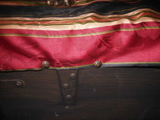 Entonces abrí las uñas y había clavado los clavos decorativos mediante el plegado en favbric, en el borde de la tapa de la caja. Primero hice la parte de atrás y luego he trabajado mi manera alrededor de la caja laboral contador del reloj. (No tienes que hacerlo en esa dirección, sólo te digo cómo lo hice.)