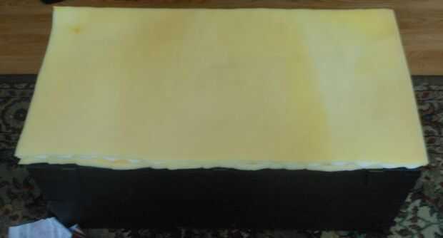 Puse el material que compré sobre la espuma. Corté el sobrante, dejando suficiente que sería capaz de doblar los bordes del material bajo.