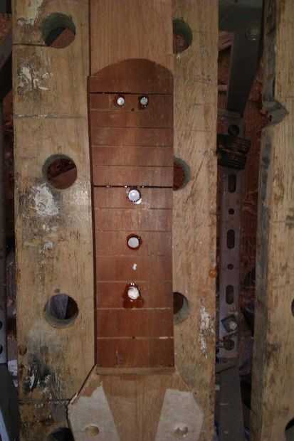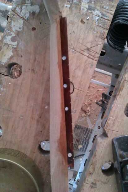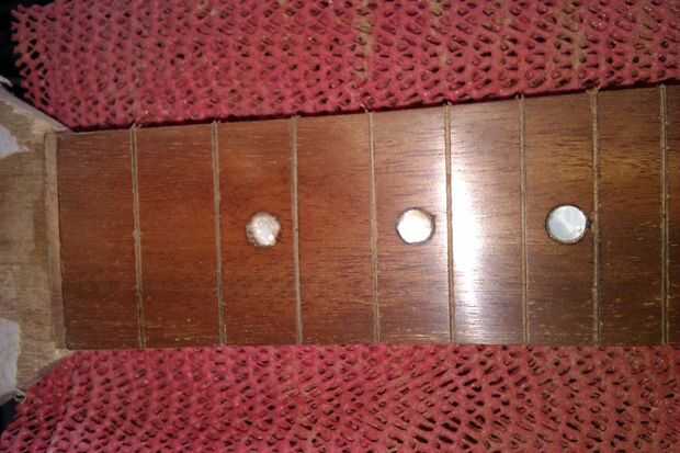 Con un poco de punto de brad perforar agujeros en chatarra y compruebe sus puntos ajuste taladro los orificios apropiados en el tradicional tercer, quinto séptimo y duodécimo traste posiciones.