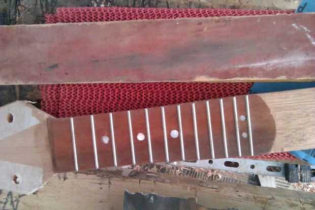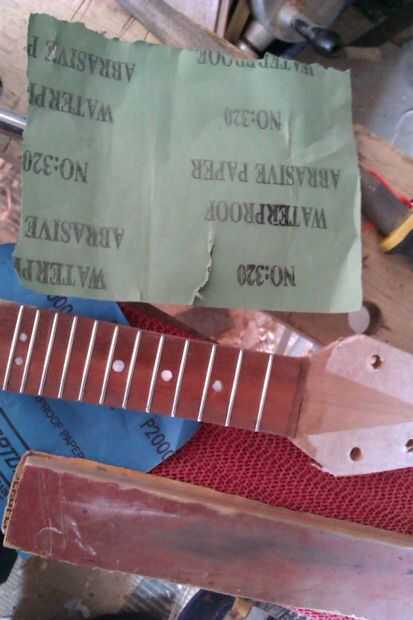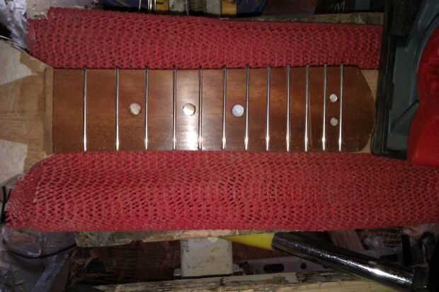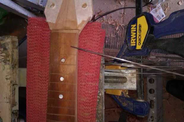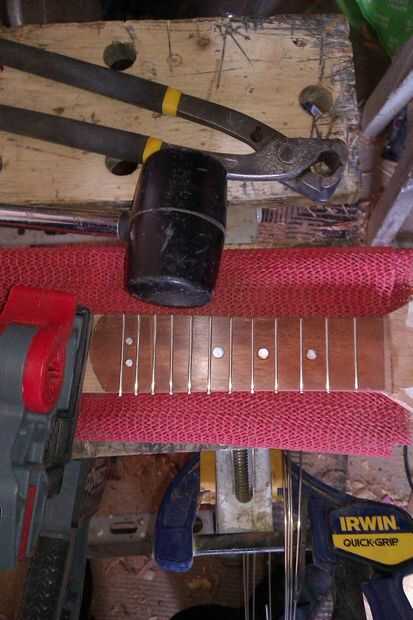 Alambre de traste es martillado con el martillo de cara suave y corte al ras con las pinzas. Luego los extremos se presentan contra el diapasón y luego se archivan en un ángulo. Un poco de lija fina en los dedos despegar los bordes agudos.