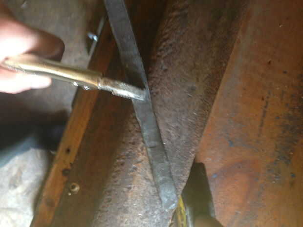 Su Vice apretones de la abrazadera debajo de la sección que desea ser torcido y utilizar su canal cerraduras torcer el metal 90 grados. Es importante que para la segunda tira de corrugado, gire en la dirección opuesta. Si no haces esto, tienes que piezas idénticas de varilla, y cuando vayas a instalar el perno, la broca no se alineará. Una vez terminados ambas piezas, vaya al paso 3.