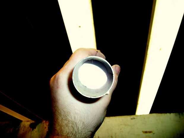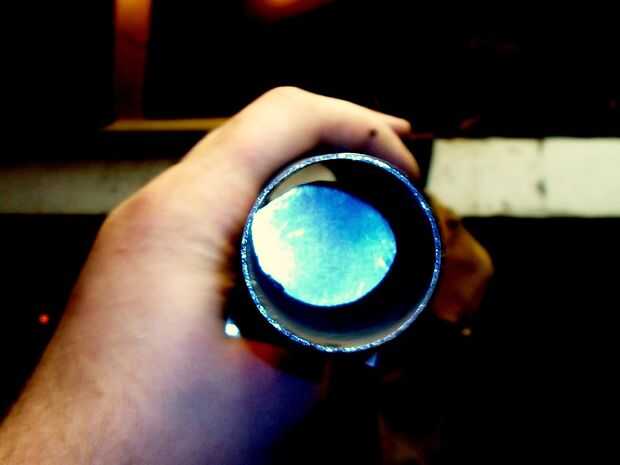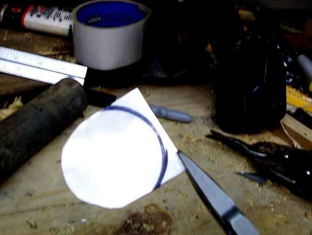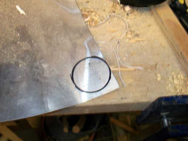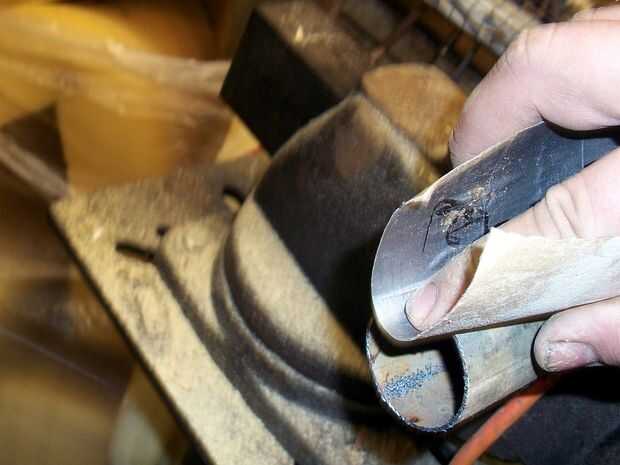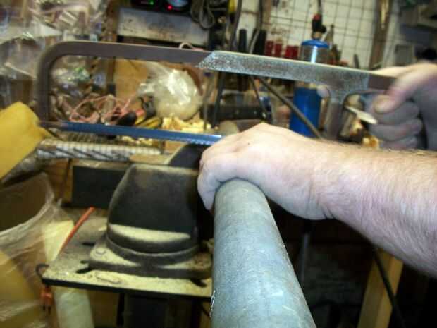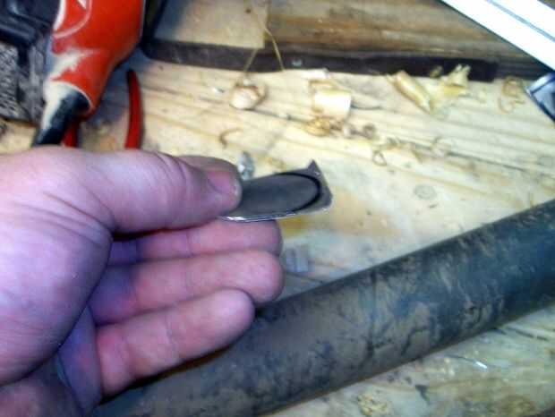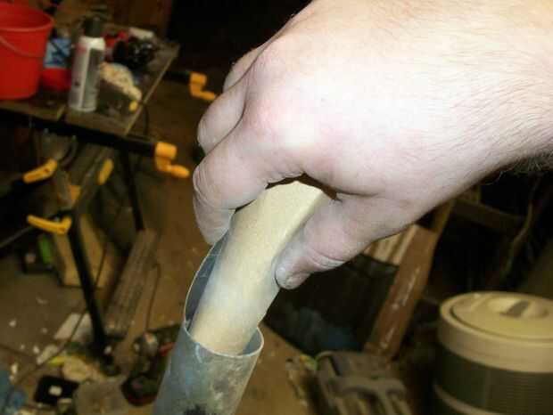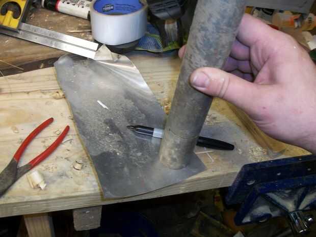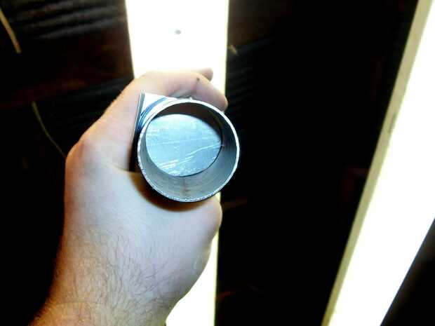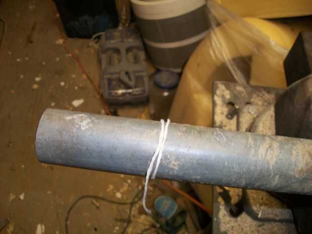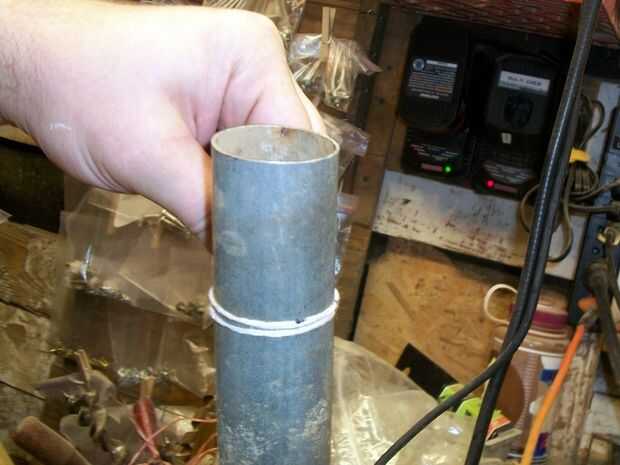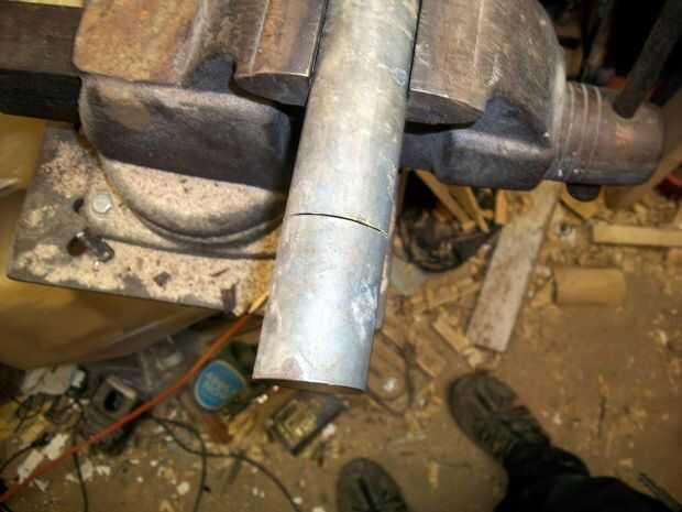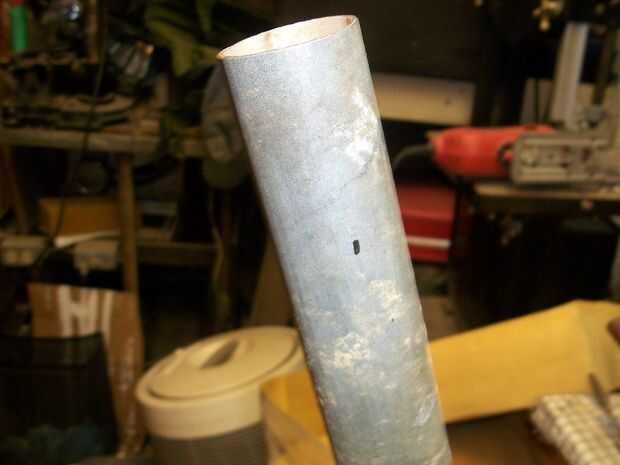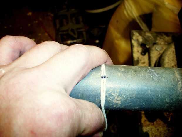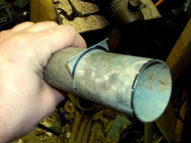 Un truco aseado que surgió, es necesario cortar el pip medio camino a través de la explosión de la puerta, así que tomé un trozo de cuerda, lo envolvió alrededor del tubo, marcado un punto de la superposición, luego lo sacó, doblé y había marcado de la parte inferior del doblez. Cuando rewrapped la cadena, asegurándose de que mi marca original conoció, tenía dos marcas equidistantes unos de otros y asierran a ellos.