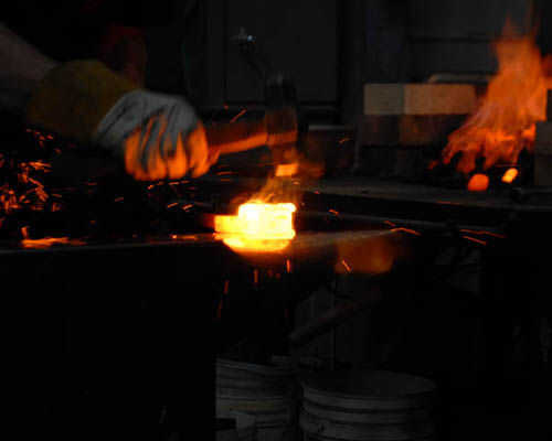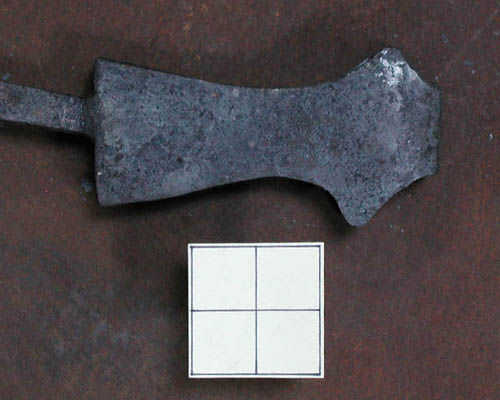 Tenga en cuenta que durante la última parte del procedimiento de soldadura de la garganta del hacha se forja más estrecho y más fino con un martillo redondeado bastante sobre la base del cuerno del yunque (no mostrado). Este es el momento de terminar la garganta, teniendo cuidado de no para fracturar la soldadura nueva con forja transversal intensa o prolongada. Siempre siga unos golpes transversales con golpes planos, soldadura para asegurar la integridad de la articulación.