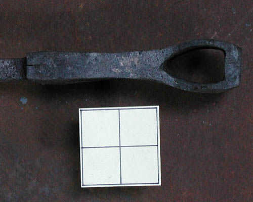 El empalme del ojo está ahora listo para soldar. El cuerpo del hacha todo se entierra en un fuego grande y limpio (yo uso coque) equipado con un chorro de aire fuerte. El coque es retenido por una pared de ladrillos sueltos unos de 8" de alto que construyo en forma de U alrededor de la olla de fuego (proyecto final). Para calentar la articulación uniformemente en ambos lados es necesario dirigir la explosión en la sección de hoja grande (por el mango) durante un tiempo precalentar antes de llevar la articulación a un calor de la soldadura. La articulación con bórax (preferiblemente anhidro) en un calor anaranjado del flujo. La soldadura llevará probablemente a 5 -6 se calienta para completar, incluyendo mezcla la bufanda. Asegúrese de extra sellar ambos lados de la articulación. Si la bufanda cónica no es propiamente soldado su borde tiene una tendencia a abrirse, sobre todo en las esquinas, cuando la hoja está forjada más delgado. La costura de dentro del ojo se debe soldar muy bien para soportar remodelando en el mandril.