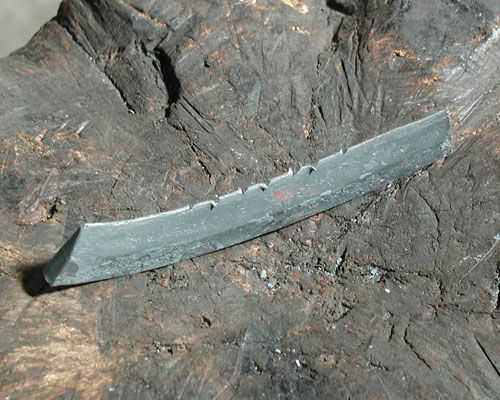 Para el poco uso 1075 acero 5/16 "x 1" en la sección transversal y cerca de 1" de más de una hendidura en el cuerpo. Forja un filo en esta pieza, dejando una banda de 3/8" ancho sin forjado. El borde afilado se corta con los dientes que se mantienen en el cuerpo de axe para la soldadura de la fragua.