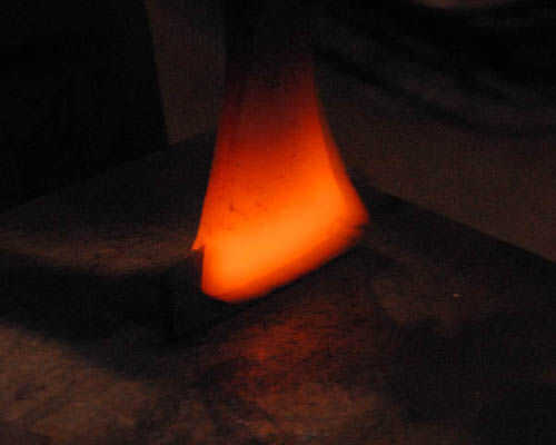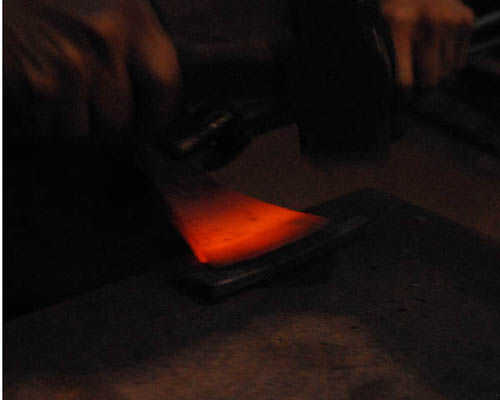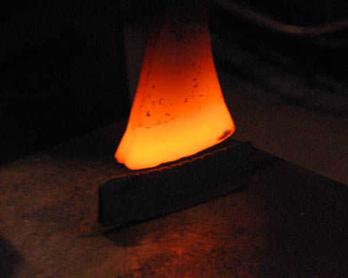 Inserte la broca fría, dentada en el eje caliente cuerpo fijar la broca en su parte posterior sobre el yunque o una mesa pesada y conducir el cuerpo de hacha abajo sobre él. Siga inmediatamente aplanando las mejillas cónicas de la hendidura firmemente sobre la broca. Todo esto tiene que pasar muy rápido para que sobrevivir siendo conducido en la caliente hendidura en los dientes pequeños. Recorte el exceso de longitud de la broca fuera a ras con el cuerpo de hacha para que la Asamblea fáciles de mover en el fuego de coque mientras se suelda lo.