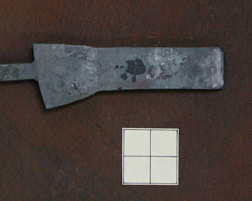 Cerca de la mitad del material en el extremo libre de la pieza (derecha) es forjado hacia fuera a un vástago recto con la dimensiones 0,6 "x 1,625" x 4.75 ". Al final de la pieza que se sujeta al manillar (izquierda) es cónico hacia abajo de la sección transversal original en el lado del pedacito a la caña del corte transversal (deje un poco material no forjado en el lado de poco para evitar estrechamiento de la hoja terminada).