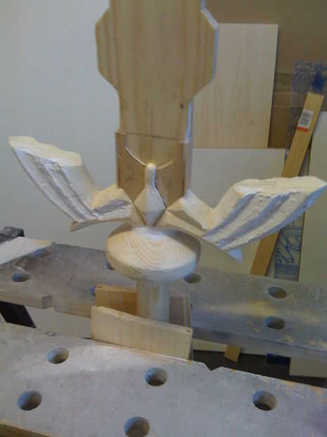 Una vez que fueron Unidas las alas y la empuñadura fue tomando forma procedí a utilizar una dremel para quitar material a las alas, añadir en el detalle de zig zag. Estos terminaron viniendo bastante ondulado como los bits que utilicé en la dremel eran bastante pequeños, pero esto se fija fácilmente con masilla para madera.