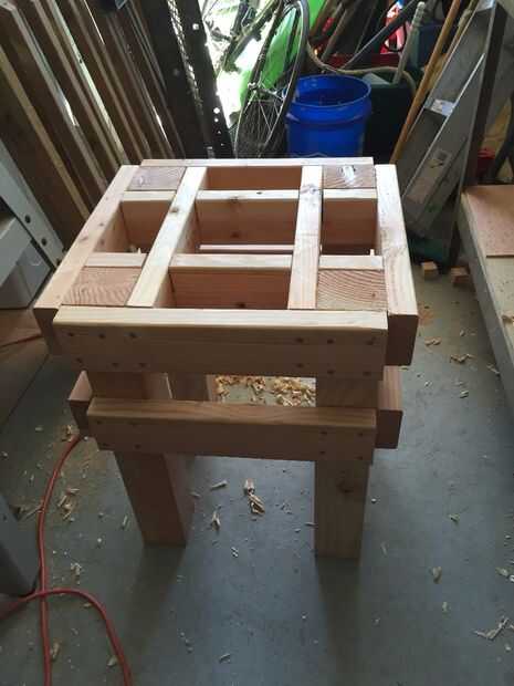 A continuación, clavado y pegado otro anillo de tableros más pequeños debajo de la parte superior, separados ancho de 2 x 4 abajo. Esto le ayudará a mantener las piernas rectas y constante.