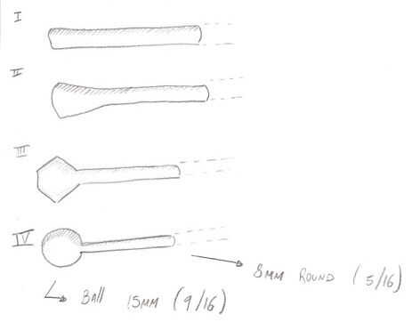 Empecé con un pedazo de 10mm material redondo (3/8) y molesto hasta que tuve 15mm (9/16) bola.