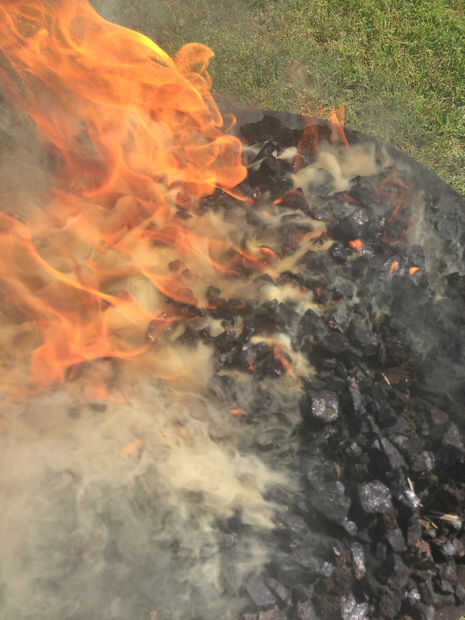 Empiezo mi fragua mediante la construcción de un pequeño fuego en el centro entonces pilling el carbón encima de todo. Entonces empiezo mi ventilador de arranque lentamente. He aprendido él trabaja mejor a manivela lentamente su ventilador tratando de bomba aire en a carbón simulado diez quemaduras más y es más difícil en el ventilador del uno mismo. tan lento y constante, beber té cuando su arranque para pasar el tiempo!