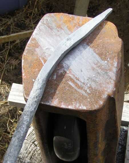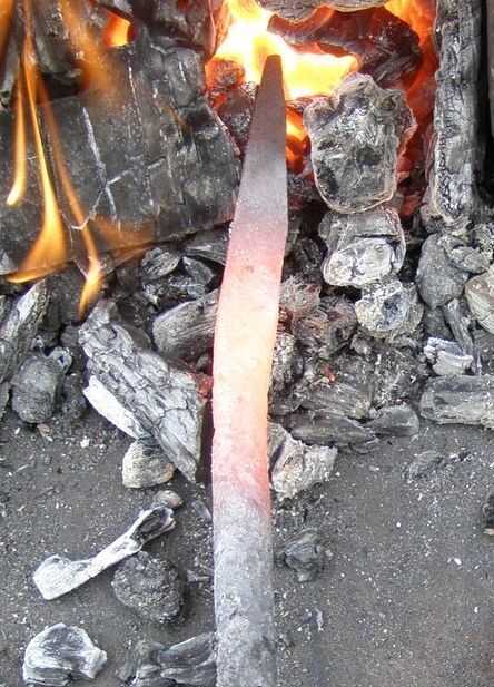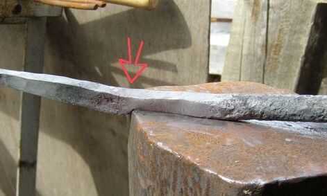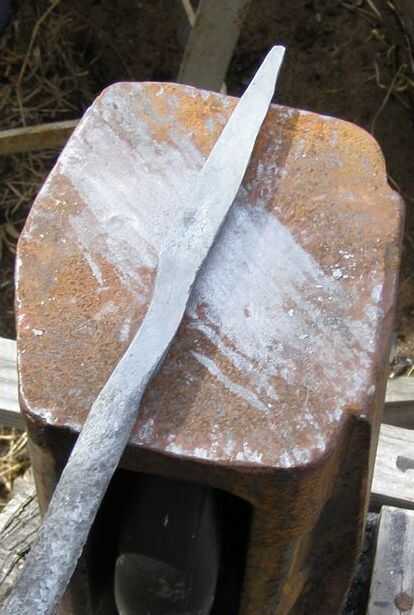 Presione la punta del cuchillo pasado el punto caliente de la fragua. Estoy tratando de calor a la zona del mango. trabajo plana y luego recalentar. Sacar y poner el borde superior del mango en el borde del yunque y golpear con el martillo mitad a y mitad del yunque.