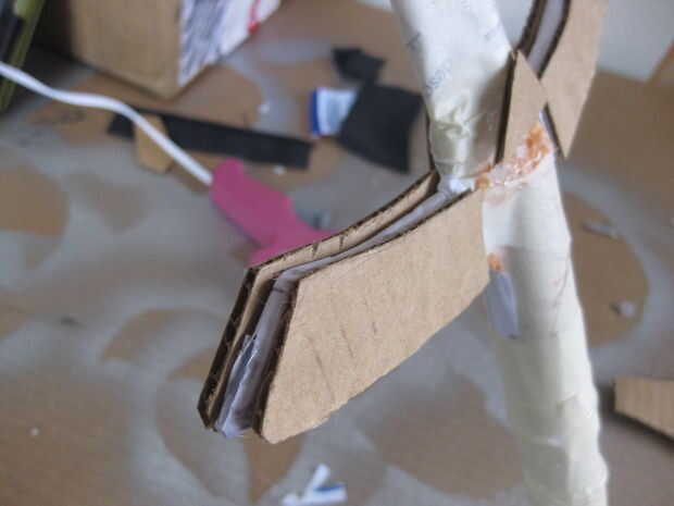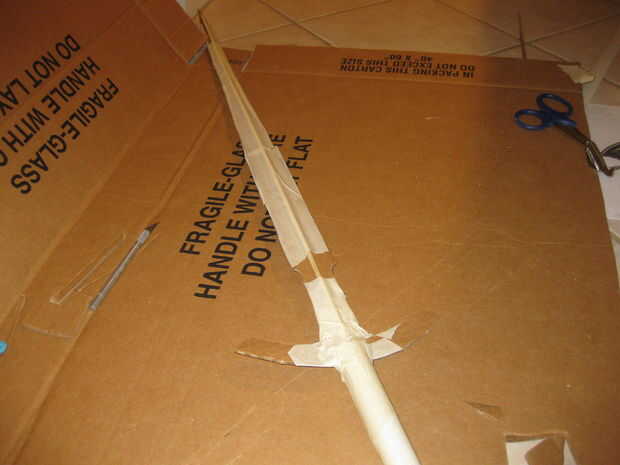 Pegamento que pega unos pequeños tacos o chop para crear un canto de centro en el centro de la hoja; hacer que la mitad de la última clavija entra en el mango. Aerosol de espuma de uretano en la manija para sostener en su conjunto; después de que se seque recorte el exceso. A continuación pegar el protector de la Cruz en varias capas y todo lo envuelva en cinta de enmascarar.