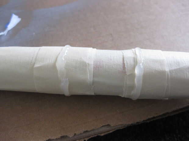 Mezcle 2 partes agua tibia y 1 parte de blanco pegamento para hacer un pegamento de la mezcla. Rasgar papel viejo en cuadritos y sumergir totalmente en la mezcla de pegamento. Capa el papel en la cinta envuelve la espada para cubrir la espada entera; Acabo de hacer 2 capas. Clip el exceso una vez seco (lijado es opcional dependiendo de cómo lisa le gusta).