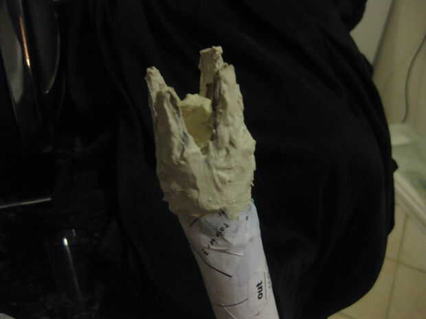 El pomo se hace insertando clavijas pequeñas en la espuma de la manija y envoltura con cinta de enmascarar o papel de aluminio para construirlo. Caliente pegamento en papel maché y accesorios '. Añadí un mitad y mitad mezcla de pegamento blanco y barro yeso para el pomo y arena suave una vez seco.