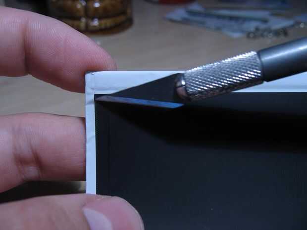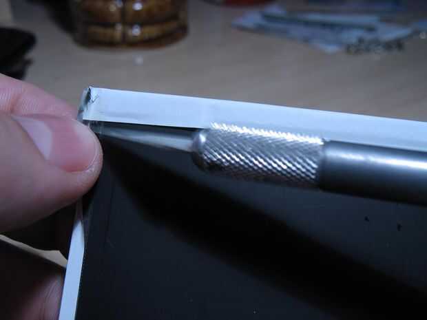 En primer lugar, voltee la imagen y la parte superior de la curva un poco. un "bulto" y se puede meter el cuchillo del exacto bajo para aflojarla. Hacerlo en ambos lados. No tienes que levantar las aletas laterales hasta levantar la parte superior uno.