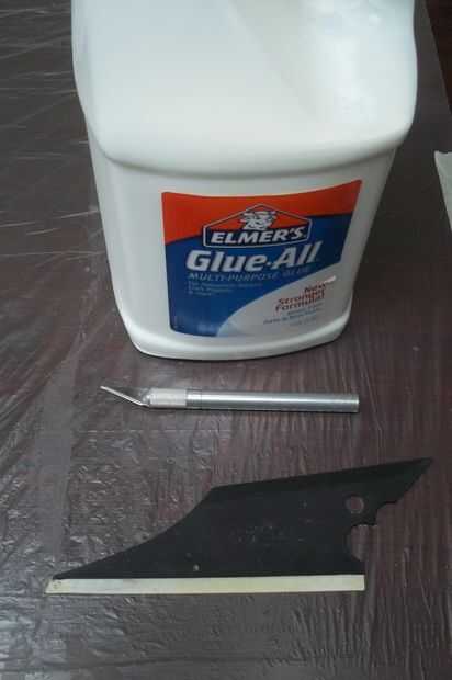Cuando haya terminado de armar su rompecabezas se necesita el pegamento y algo a difundirlo con. La negra herramienta que utilizo es un squeegy desde una ventana de teñido kit. En mi foto la botella del pegamento es una botella de 1 galón.  He hecho un montón de puzzles con esta botella.  También utilizo el pegamento para otras artesanías, por eso pasé los 12 dólares por una botella de galón.  Esta es la cola blanca normal, embarcaciones también hace un pegamento claro pero no he probado a usarlo.