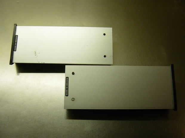 A continuación tienes que taladrar un orificio en uno de los sidepanels plástico negro para montar un jack 1/4 phono. Entonces también necesita perforar algunos agujeros más en algún lugar, probablemente por debajo el chasis si doesn´t ya existen. Cual doesn´t en los pedales de Fender. Los agujeros debajo de están hechos para que pueda obtener los dos montados juntos y en mi caso también para sostener la... ehrm... PCB en su lugar.