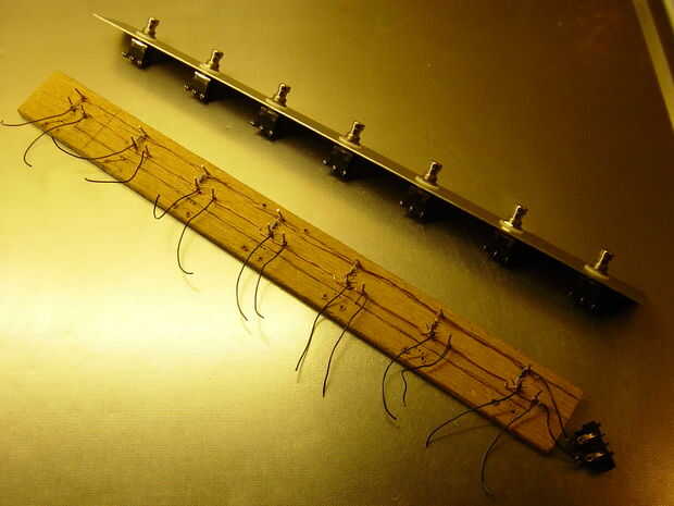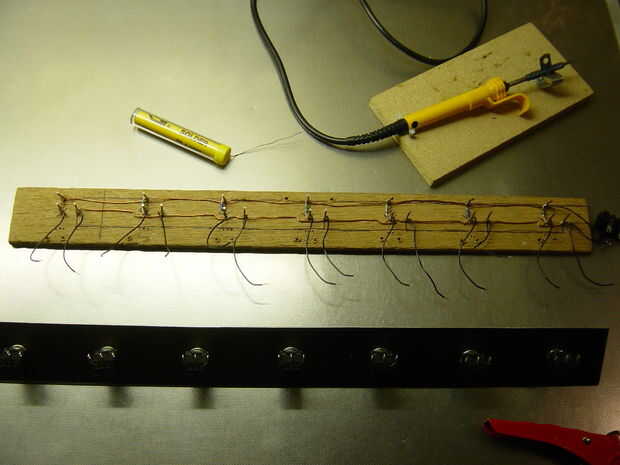 A continuación es el momento de hacer su... ehrm... () PCB. Yo uso un poco pedazo de madera que es genial porque no te dará ningún atajo eléctrico por sí mismo. Mi cableado realiza de cobreAlambre no aislados que cableado alrededor de los clavos de cobre. También se suelda cada cableado alrededor de cada uña.