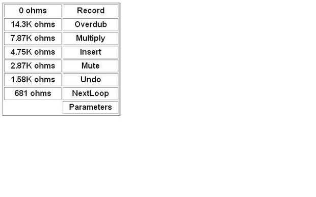 "El circuito para un interruptor conectado a la toma del pedal es muy simple. Es solo una resistencia y un interruptor momentáneo conectados en serie entre la punta y manga del gato. Presionar el interruptor conecta la punta y manga juntos a través del resistor. Los valores de resistencia determinan la función que se ejecuta el Echoplex. Estos interruptores pueden ser en paralelo, aunque si pulsas varios a la vez obtendrá resultados impredecibles."