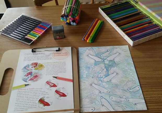 Forma creativa colorante peces usando marcadores de terapia de arte grande en un fondo de agua parte 2
