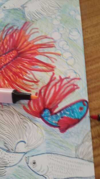 Marcadores usando azul de cielo, rojo oscuro y color de rosa a punto el cuerpo y hacer el alto! (Este pez no resultó gran)