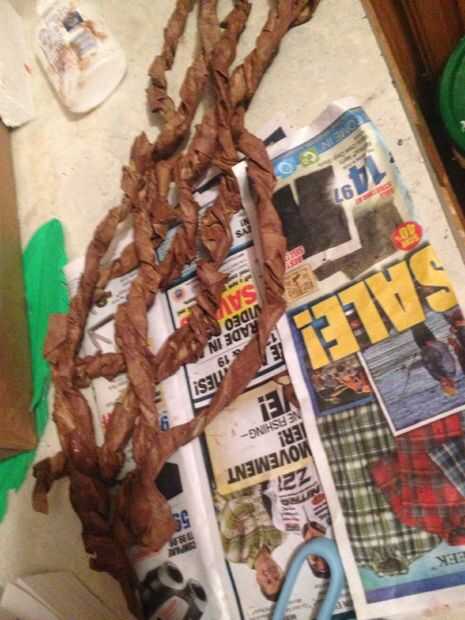 Ahora utilizar su pegamento o mod podge y mezclar café con él, empezar por torcer las tiras de papel con la mezcla de marrón que acaba de hacer, gire hasta el final... Esto es un desorden así que tenga paciencia... Si utilizas mod podge encontré seca casi de inmediato, pero es un poco caro usar de esta manera, esto es donde pasos pegamento de Elmer poderoso viejo, tomó un poco mientras pero mejor general en el aspecto de acabado vid.