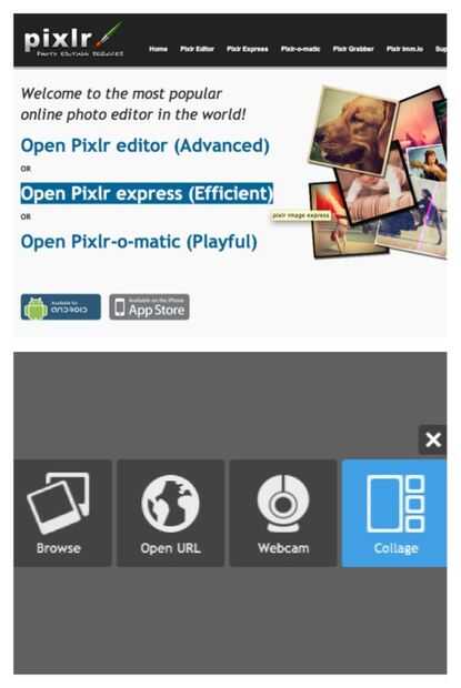 Verás que hay 3 diferentes versiones de Pixlr, que eres Bienvenido explorar también. Pixlr editor es la versión avanzada y es similar a Photoshop. Por otro lado, Pixlr-o-matic es la versión lúdica, que le ayuda a editar tus fotos con diferentes filtros y fronteras. Opté por usar Pixlr Express, específicamente la ficha collage.