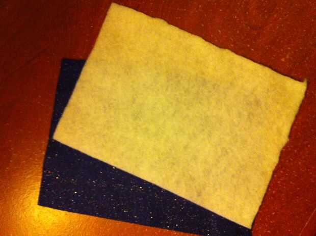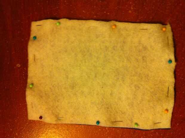 Coge las dos piezas de fieltro y medir cada 5 x 7 pulgadas. Agarra una regla y medir. Agarra un par de tijeras y cortar las piezas de fieltro. Después de las dos piezas se recortan, perno utilizando las clavijas. Al coser los pedazos juntos, las patillas ayudan a mantener a la tela en su lugar, haciéndolo más fácil de coser.
