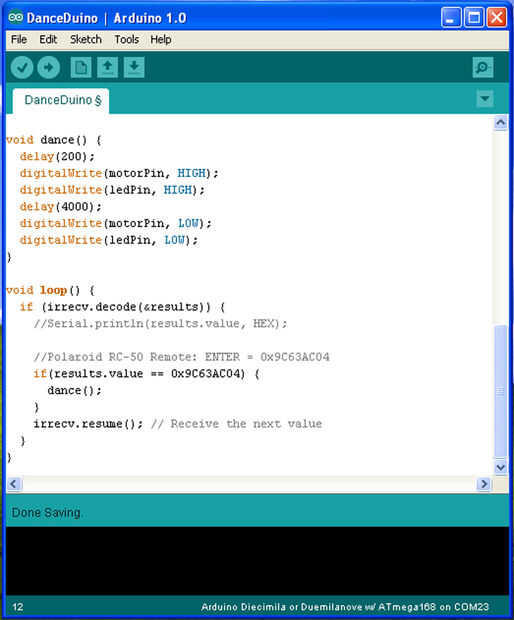 Yo también uso otro ejemplo, IRsendDemo.ino, para decodificar mi Polaroid IR remote, para obtener el valor de la tecla Enter, para que pueda utilizar el botón Enter para encender el motor. (Ver detalle de cómo hacer esto en el blog de Ken en el enlace mencionado arriba.)