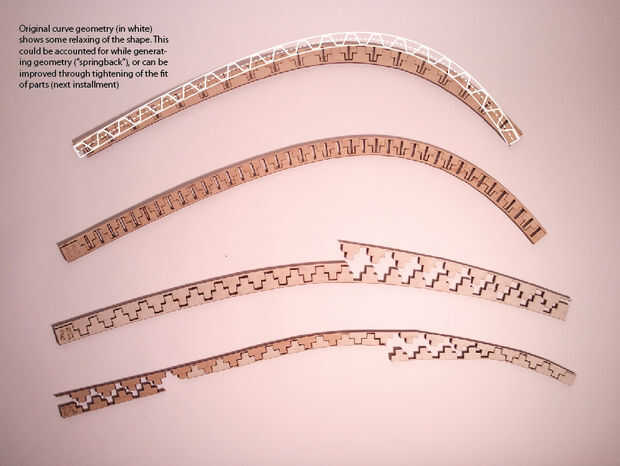 Así por esta vez he pegado a mis herramientas conocidas (grasshopper, rhino, lasercutter) y comprobar que mi idea es conceptualmente factible. Por curiosidad, quería echar un vistazo a las distintas pruebas juntos y compararlos con la curva original que dibujé en Rhino. Esperaba la curva con bastante bien, dada la experiencia previa con zipshape. La prueba reveló un bastante bien, aunque no perfecto. Para obtener la fidelidad de la curva perfecta, necesitaré apretar un poco la geometría o representan un factor de "springback", ambos que estarían sujetos a los materiales particulares y máquinas utilizadas en la fabricación. Ahorraré para la próxima entrega.