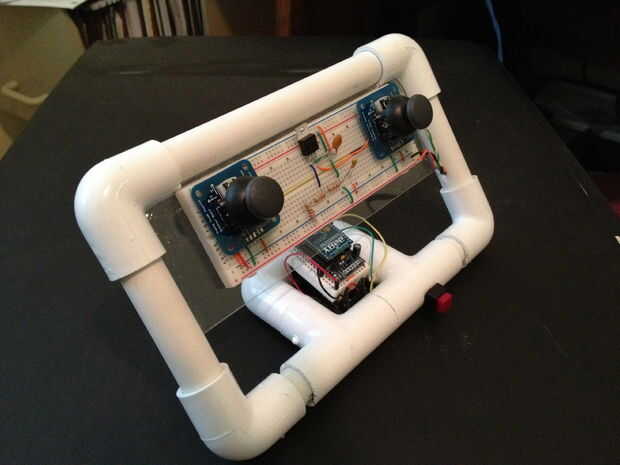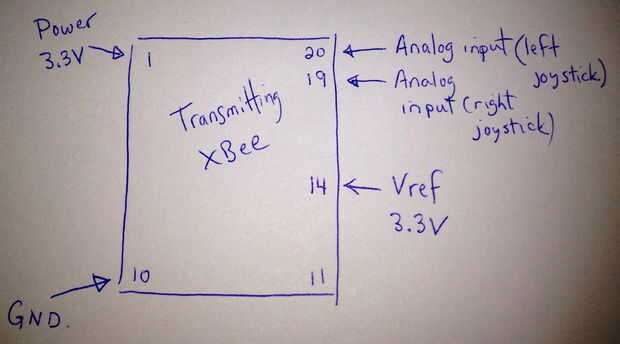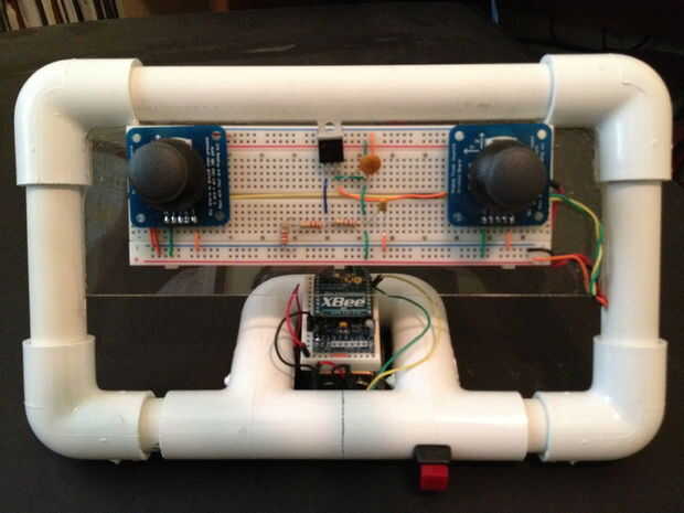 El diagrama de transmisión XBee indica que los cables necesitan estar conectados en el XBee que transmite. También puede notar en la foto que tengo un interruptor instalado. El flujo de electricidad va de la batería de 9V para el regulador de 3.3 V y además de alimentar la placa por el poder de la palanca de mando debe regresar al XBee para poder así. Animo a cable de la unidad exterior el PVC primero para que sea funcional y luego limpiarla según sea necesario. El PVC proporciona un conducto excelente para ocultar los cables. Como se muestra y luego pasar al paso siguiente donde nos pondremos el robot preparado para controlarse.