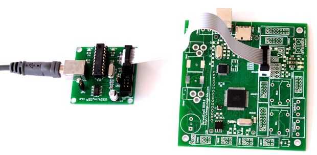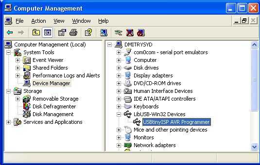 A continuación necesitamos un programador ISP, vamos a tomar como ejemplo USBtinyISP AVR ISP programador de Atmel (por ejemplo, éste: http://www.ladyada.net/make/usbtinyisp). Cuesta cerca de $15USD, suministrado con dos cables planos (para 10 y 6 conectores) y es capaz de proporcionar un tablero intermitente con + 5V. Descargar drivers USB para el programador, están disponibles en http://blog.arduino.cn/wp-content/uploads/2009/05/usbtinyisp-w32-driver-v112.zip. Conectar el programador al PC por un cable USB, Windows debería informar sobre el nuevo dispositivo y pedirá drivers. Descomprimir e instalar el archivo descargado solo. Ahora en Administrador de dispositivos debería aparecer un nuevo dispositivo llamado programador de AVR USBtinyISP en grupo de dispositivos de LibUSB-Win32.