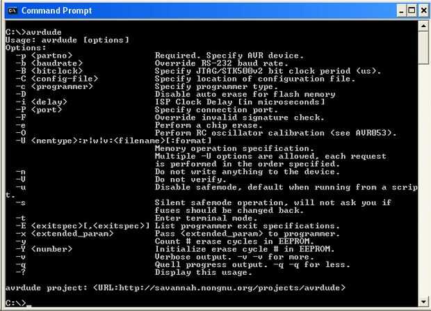 Descargar e instalar WinAVR de http://winavr.sourceforge.net. Abra el símbolo del sistema y tipo 'avrdude' - deben recibir lista de opciones como resultado.