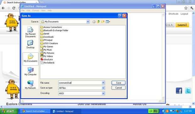 Ahora, ir a guardar como y asígnele el nombre como command.bat. Asegúrese de que agrega .bat, o esto no funcionará. También asegúrese de cambiar el formato de archivo debajo de .txt a todos los archivos.