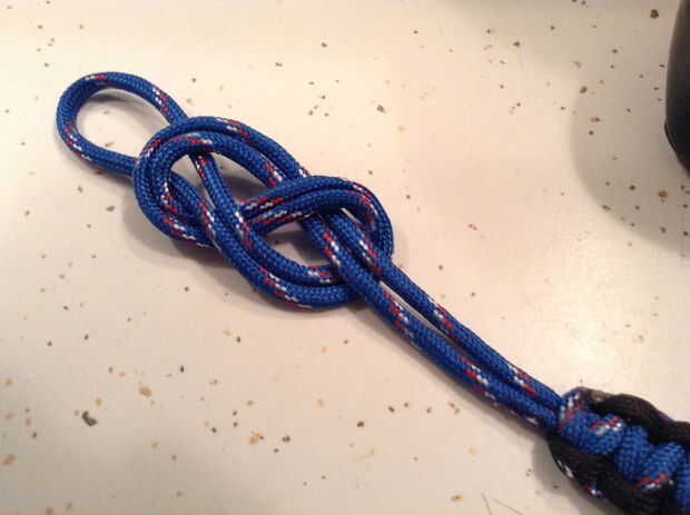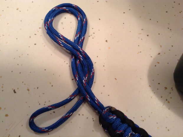 Este paso puede ser tan simple o avanzada mientras que usted elige. En mi caso, usé paracord en un patrón de la armadura de cobra, sin embargo, esto podría ser simplemente un solo lazo de la cuerda atada en un nudo. El paracord atado es agradable ya que agrega circunferencia a la cuerda de apertura y cierre. La longitud de la soga de la cuerda debe ser alrededor de 15" aunque quizás tenga que experimentar un poco para encontrar la longitud que trabaja para su perro.