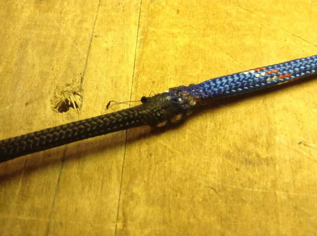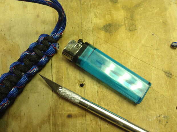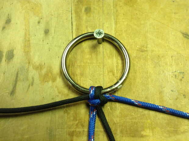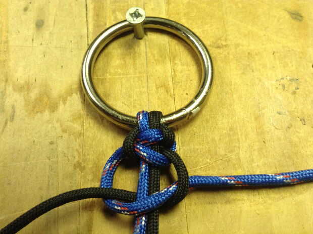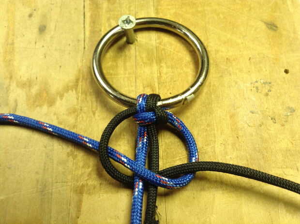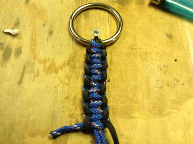 Para amarrar una armadura de cobra de paracord, necesitarás 8-10' de paracord. Si opta por utilizar dos colores de cordón, simple calor dos extremos con el encendedor y fusionarlos juntos. Crear un bucle en un extremo y pasar los 2 extremos libres a través de su anillo de metal. Ahora estás listo para una armadura de cobra. Tras las fotos de arriba, pase un extremo (azul) en la parte superior de ambas cuerdas. Pase el otro extremo libre (negro) sobre el primer extremo libre (azul) con dos cables y a través del lazo creado por el primer cable (azul). Ajuste y repita en sentido contrario manteniendo el primer cordón (azul) y el segundo cable (negro) en la parte inferior. Una imagen vale 1 mil palabras--seriamente difíciles de describir pero siga las fotos! Cuando termine de atar, use un cuchillo para cortar el paracord y fundir el final con su encendedor.