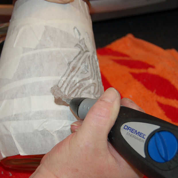 Donde quita la cinta que ahora se movimiento suavemente en el vidrio. No necesita aplicar mucha presión, deje que la herramienta de grabado a hacer lo que se supone debe hacer. Para un efecto más pronunciado, volver sobre el diseño. También puede hacer sombra al aumentar la velocidad del grabador.