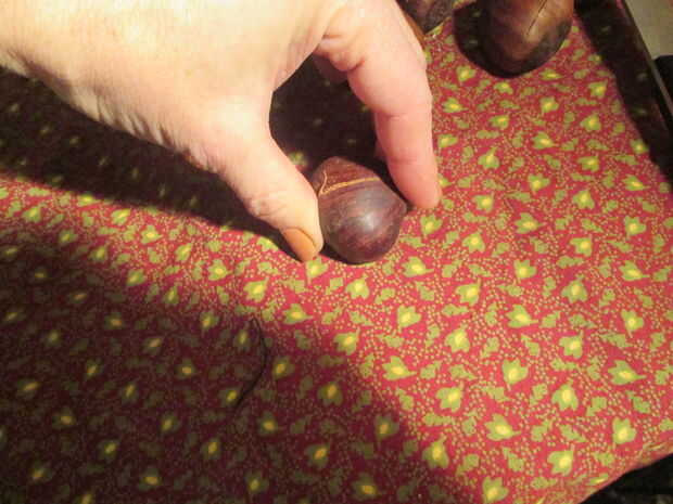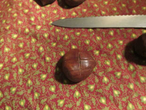 Ello, agarrándolas firmemente, el castaño lado plano hacia abajo (una vez en un tiempo no habrá un lado plano obvio, solo espera en los bebés aún más estrictos) y lentamente a lo largo del grano en la parte superior, luego en el grano para formar una x. Las líneas deben ser aproximadamente una pulgada o más largo y no más de un 1/8 de pulgada profunda. Está bien si se corta en la tuerca un poco (mejor que el corte en el lado del dedo)