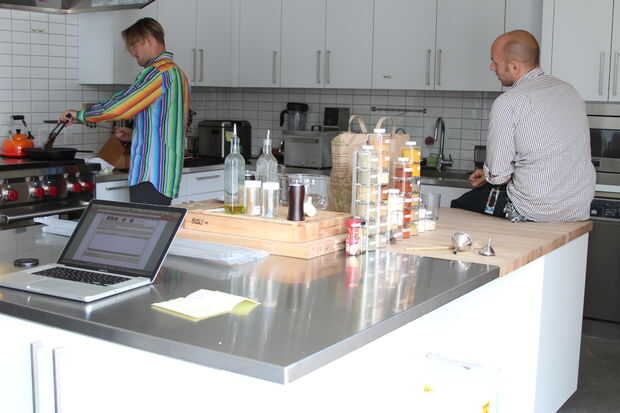 Los gabinetes son laminado blanco. Las encimeras son principalmente de acero inoxidable; la mitad de la isla es bloque de carnicero madera.