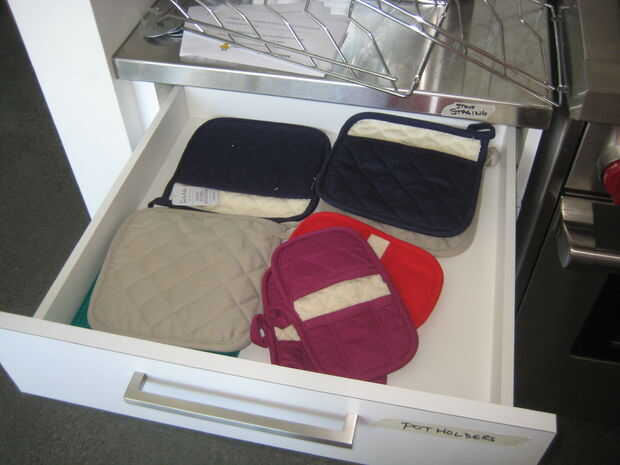 - Los sostenedores de pote se guardan en el cajón a la izquierda de la estufa.