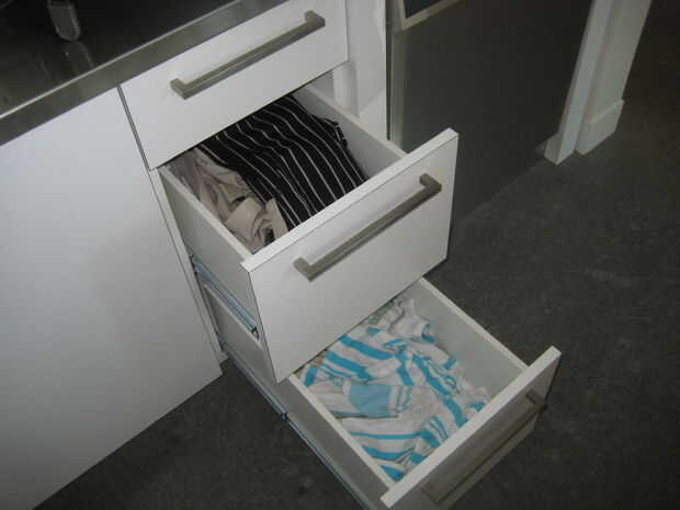 - Ropa sucia de todos los tipos se guardan en el cajón de abajo a la derecha del fregadero a la espera de lavado.