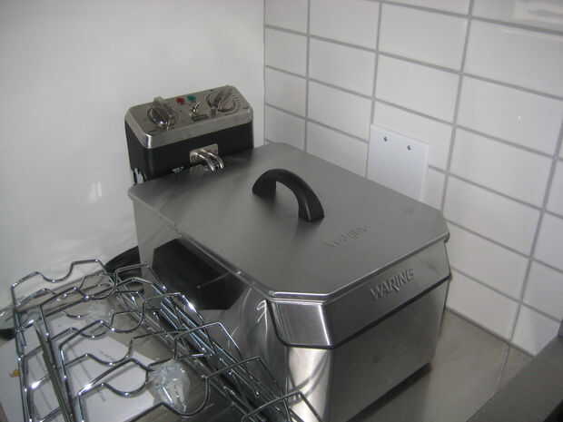 La freidora grande es un Waring comercial pesados freidora y se mantendrá en el contador y está a la izquierda de la estufa. Tiene una canasta por dentro. Alimentos sólo deben ir dentro de la canasta. No toque la canasta ya que se calientan. Esto también tiene dos cestas y los mangos. Estos se mantienen en el estante inferior del armario con la freidora pequeña.