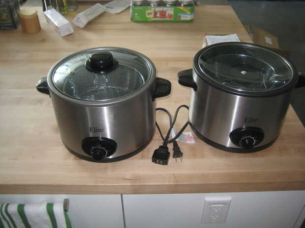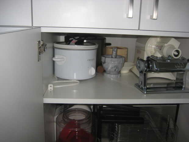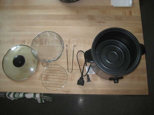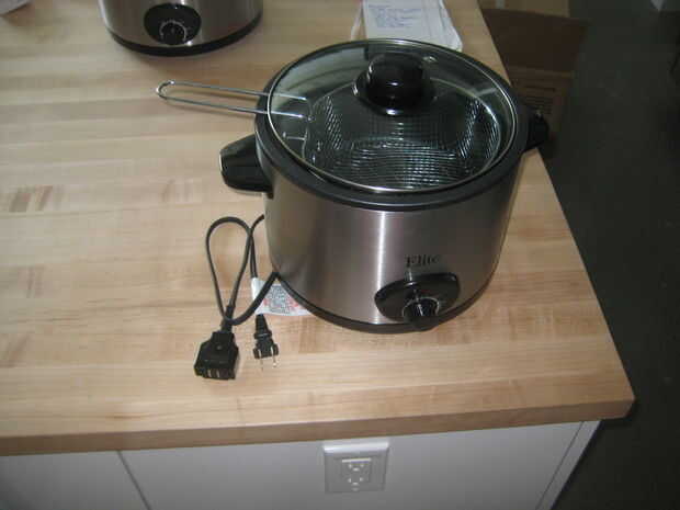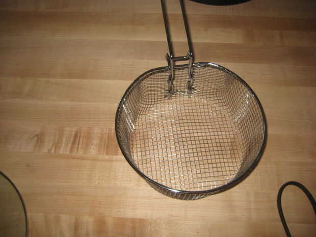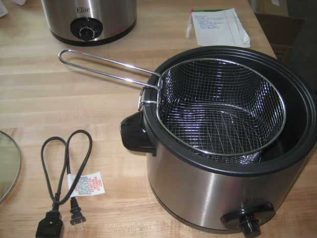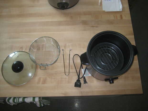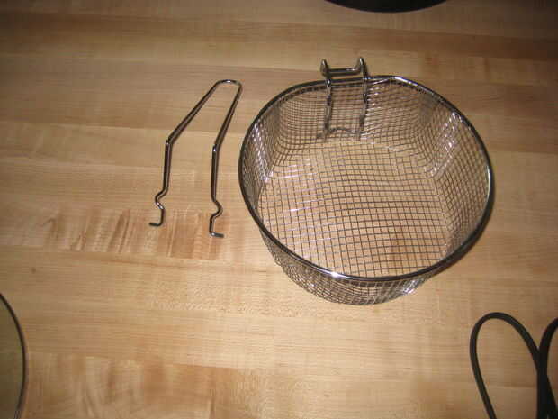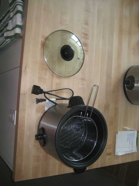 La freidora pequeña se mantiene en el armario bajo los artículos de la despensa a la izquierda de la nevera. Tiene una cesta, el mango y el soporte que viene con él. Es todo el metal y no debe tocarlo con las manos cuando está caliente porque quemará! Utilice las agarraderas.