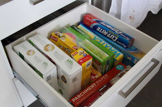 Armario despensa izquierda, justo a la derecha de los libros de cocina.