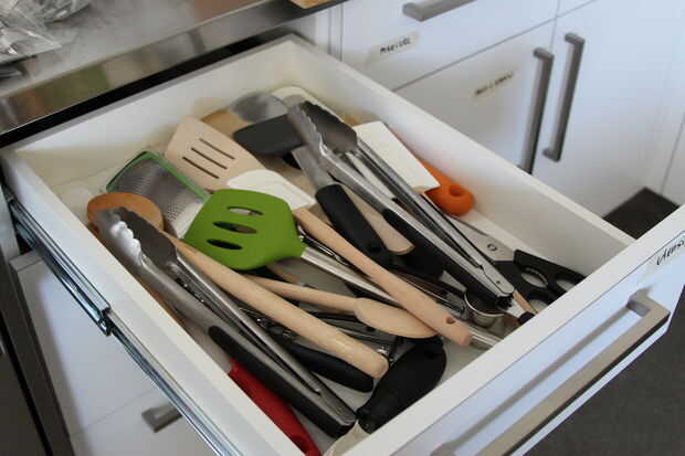 Actualmente hay tres cajones a la derecha de la cocina dedicada a los utensilios. Además, cuelga estantes por encima de la estufa para fácil acceso.