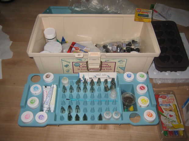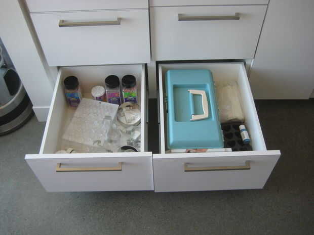 Pastel decoración de fuentes y cortadores de la galleta se guardan en los cajones de abajo a la izquierda de la nevera al lado de la ventana.