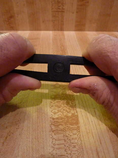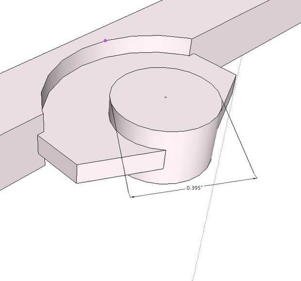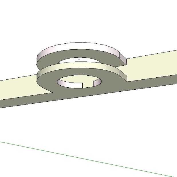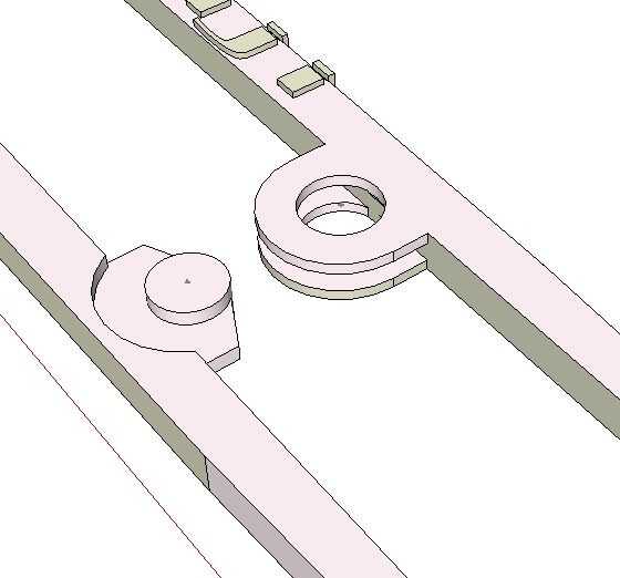 El diámetro del perno (parte redonda) es poco más de 3/8" de diámetro. Se une a uno de los palos a través de un soporte central montado. El otro palillo tiene 2 gobios (las piezas con los orificios) que están al ras con la superficie del palo. Los espacios entre estos componentes se dibujan mucho más grande que un producto de moldeado por inyección comparables, lo que permite la difusión de la plástica. Esta extensión variará dependiendo de la velocidad de la impresora, el tipo de plástico, la velocidad de la extrusora y las temperaturas de su cabeza y la cama.