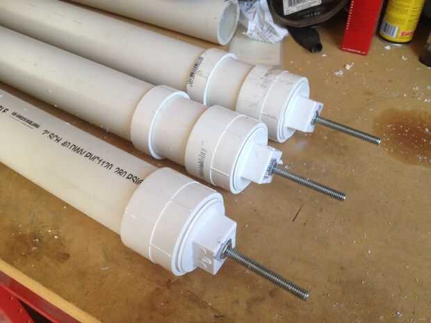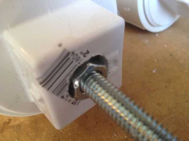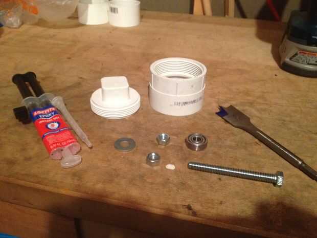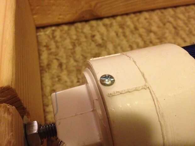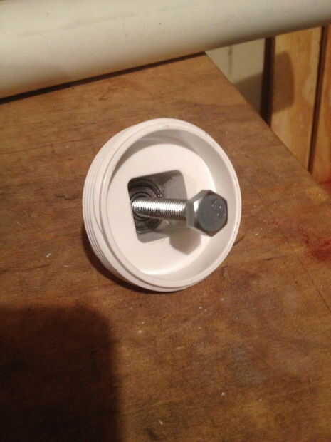 Una vez que el perno en su lugar, puede este montaje en el adaptador de roscado del tornillo y luego pega en el tubo, uno en cada extremo. Usted necesita a cualquier pegamento plástico roscado del casquillo en el adaptador de hembra, o hacer como hice y poner en un conjunto de tornillo (ver imagen). De lo contrario las tapas del lado derecho del trainer se Desatornille se partir del par cuando está en uso. Usé un tornillo porque quería ser capaz de desmontar los tubos en caso de que hay un problema con los rodamientos en algún momento.